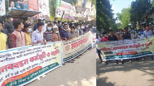 নরসিংদীতে ডিপ্লোমা ইঞ্জিনিয়ারিং শিক্ষাক্রমে সব সেশনের সব বর্ষের শিক্ষার্থীদের অটোপ্রমোশন দাবিতে মানববন্ধন কর্মসূচি পালন করেছেন পলিটেকনিক শিক্ষার্থীরা। বুধবার (২৮ অক্টোবর) সকাল ১০টায় নরসিংদী প্রেসক্লাবের সামনে এ মানববন্ধন কর্মসূচি পালন করা হয়। এতে অংশ নেন- নরসিংদী তাঁত শিক্ষা ও প্রশিক্ষণ ইনস্টিটিউট, নরসিংদী সরকারি ও বেসরকারি পলিটেকনিকের শিক্ষার্থীরা। এ সময় শিক্ষার্থীরা সব বর্ষের অটোপ্রমোশন ও আষ্টম পর্বের পরীক্ষার্থীদের দ্রুত ভাইভা চূড়ান্ত ও ফলাফল প্রকাশের দাবি করেন। শিক্ষার্থীরা বলেন, করোনা মহামারির কারণে আমাদের এক বছর ক্ষতি হয়ে যাচ্ছে। আমরা করোনার মধ্যে স্বাস্থ্যঝুঁকি নিয়ে পরীক্ষা দিতে চাই না। শিক্ষামন্ত্রী ড. দীপু মনির কাছে আমাদের আবেদন নিয়ে দ্রুত সিদ্ধান্ত চাই। এ ছাড়া কারিগরি শিক্ষার মানোন্নয়নে দ্রুত পদক্ষেপ নেয়ার দাবি জানিয়েছেন শিক্ষার্থীরা।